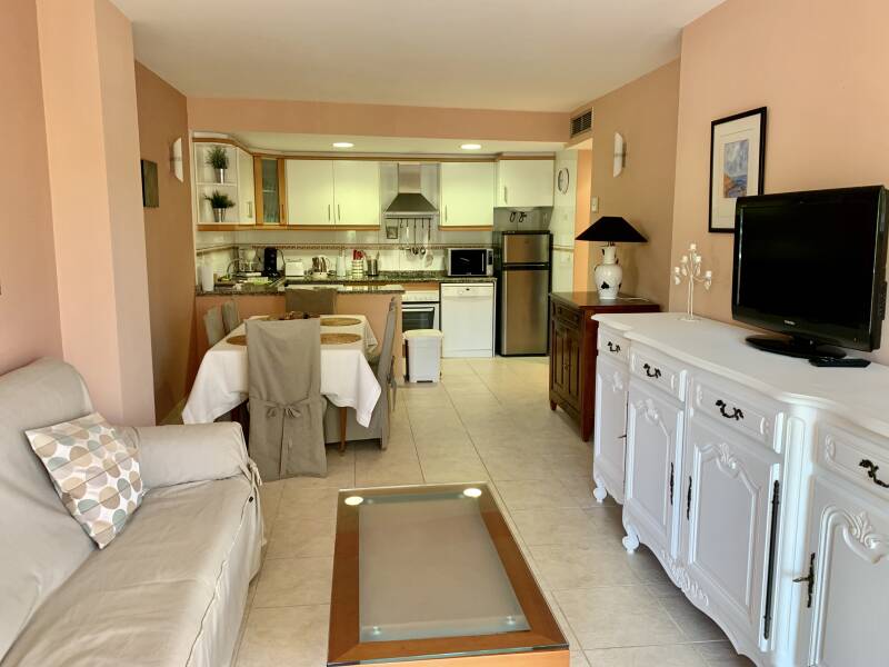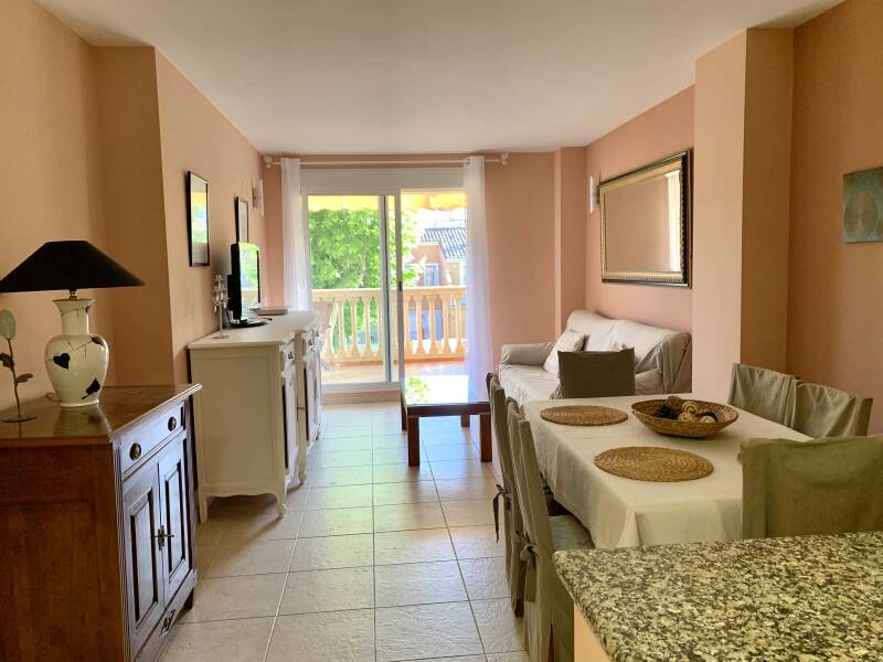 Salle à manger pour 6 personnes, salon avec TV et lecteur DVD